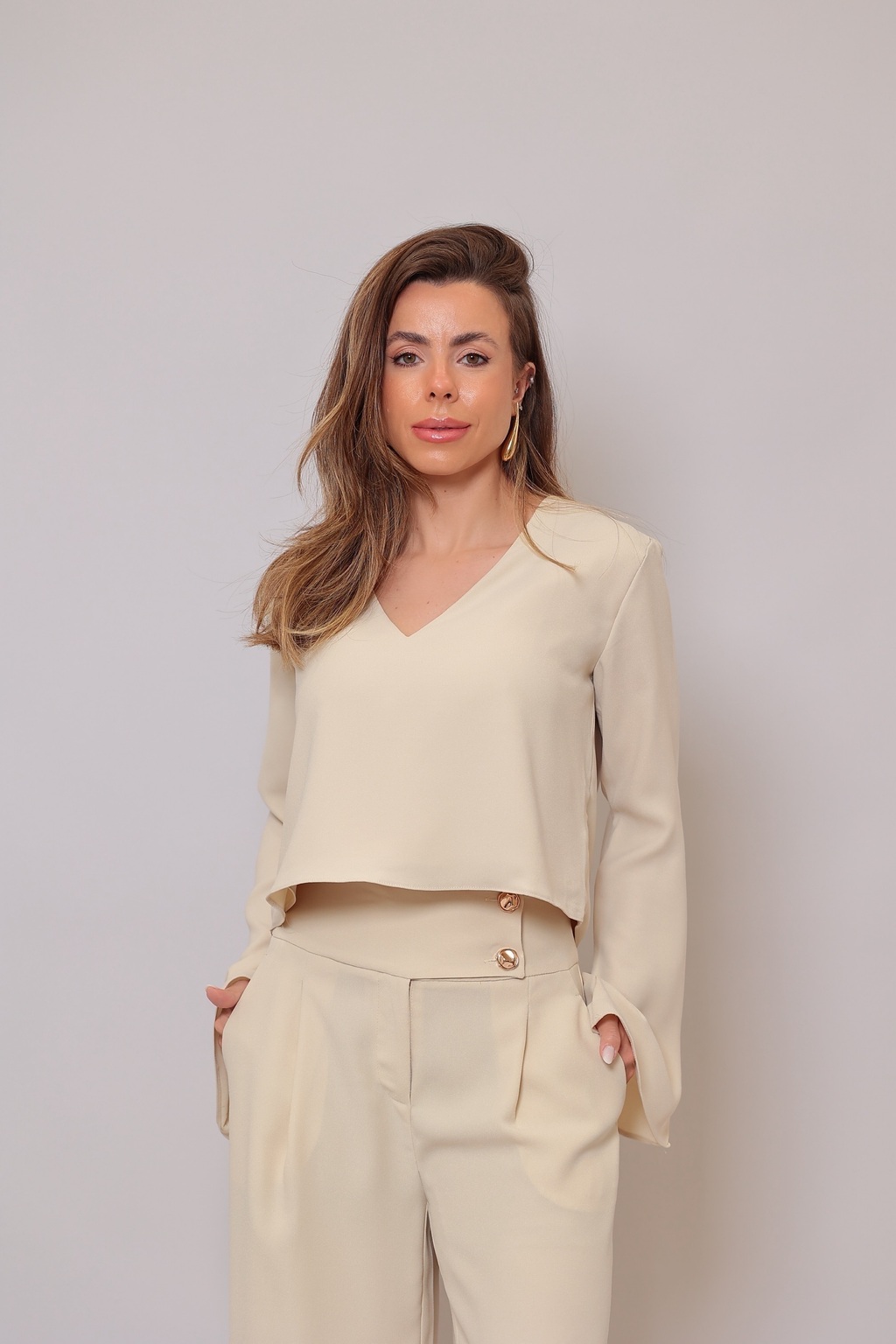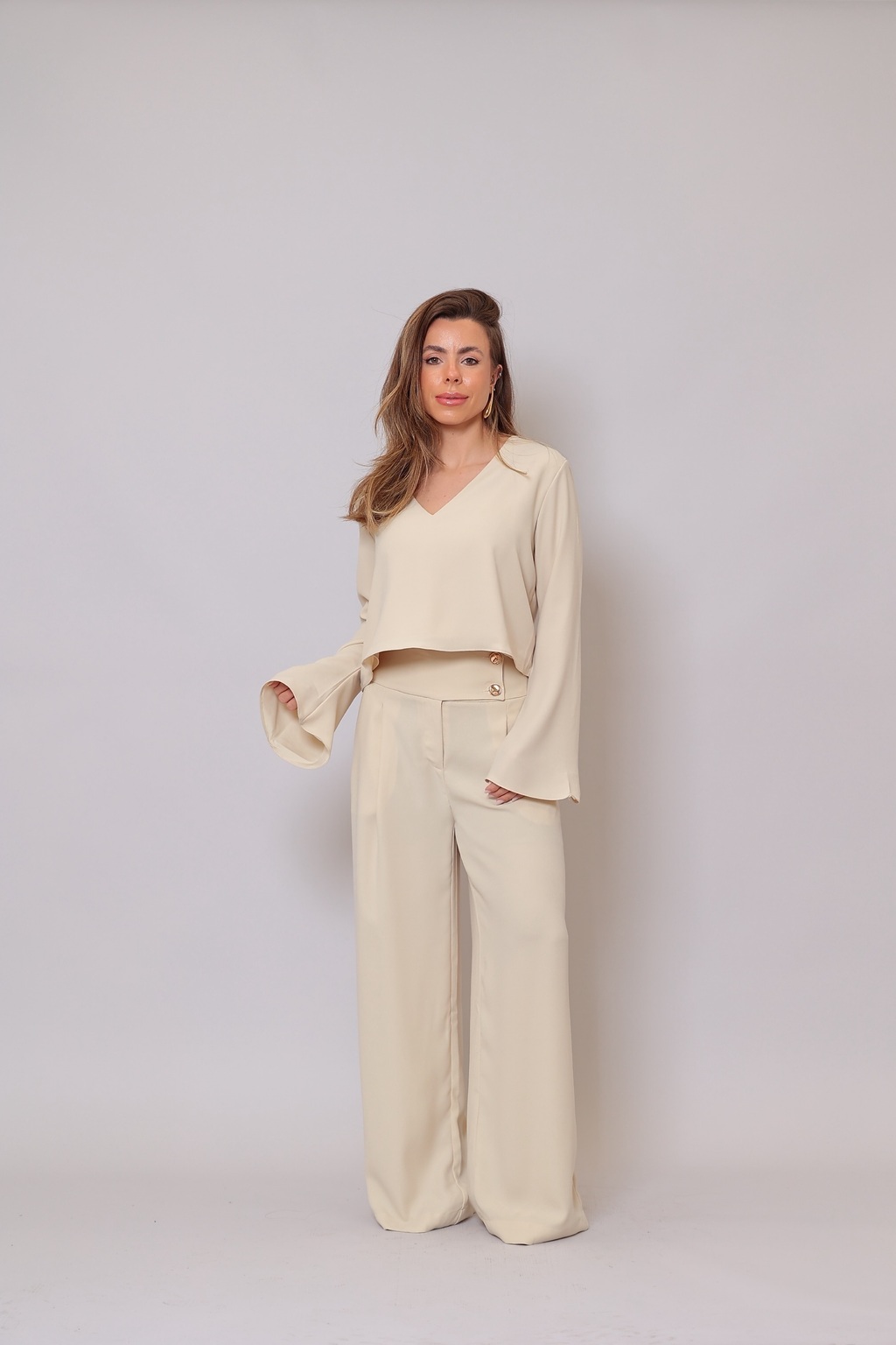 Detalhes que encantam: - Tecido leve e sofisticado para máxima elegância - Blusa com caimento soltinho e punhos flare que valorizam o movimento - Calça de alfaiataria com botões dourados decorativos e cintura estruturada - Cor neutra, perfeita para looks versáteis e atemporais
