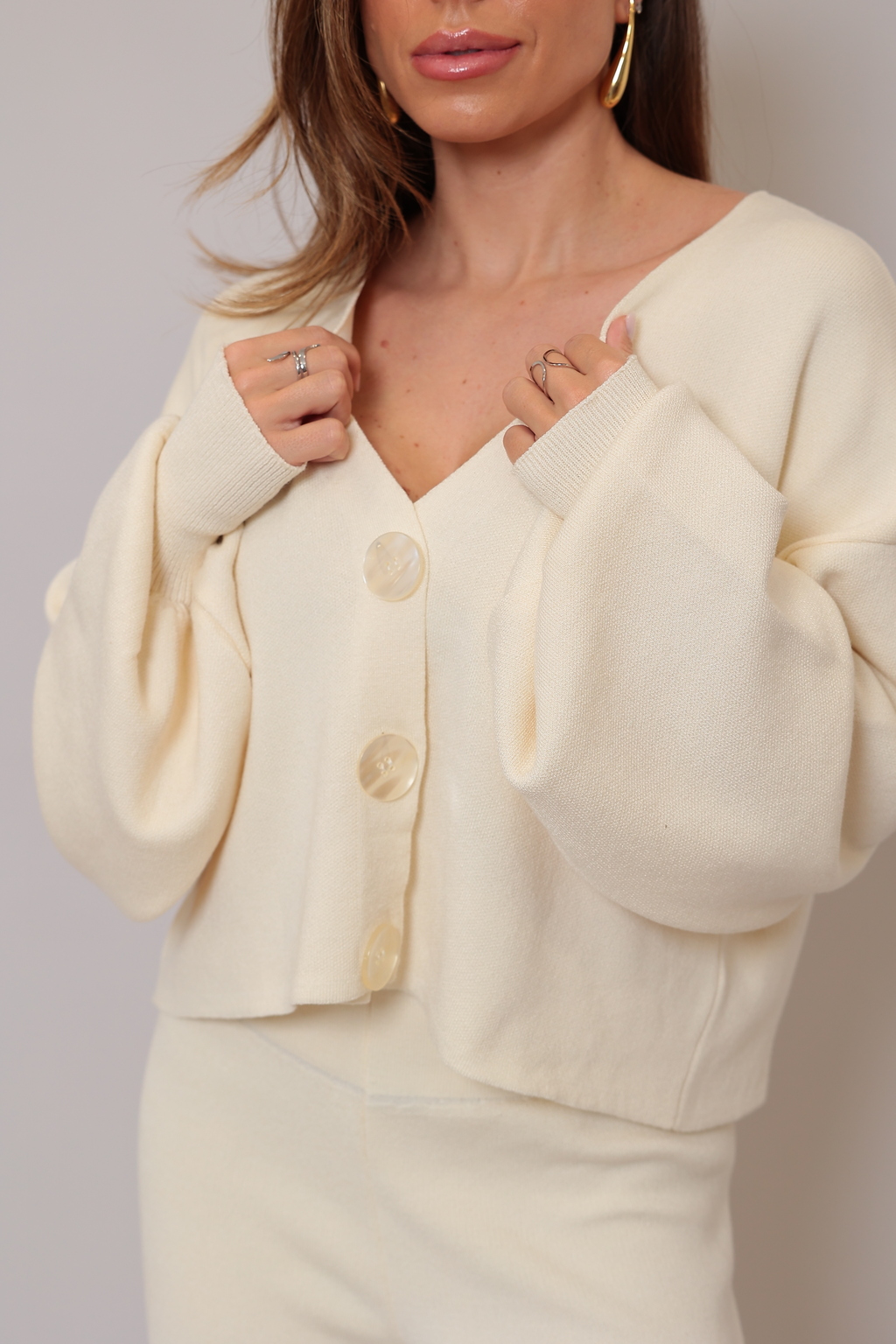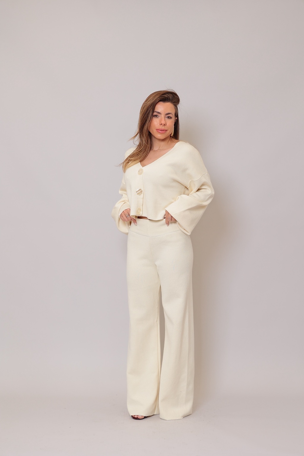 Conjunto Tricot Olívia - Verde: Elegância e Conforto em Harmonia O Conjunto Olívia é a escolha perfeita para quem valoriza estilo e praticidade. Produzido em tricot modal, oferece toque macio e caimento impecável. A blusa com botões maxi e modelagem soltinha harmoniza com a calça de cintura alta, valorizando sua silhueta com conforto. Ideal para transitar do trabalho ao encontro casual com charme e sofisticação. Tamanho único | Cor Off White sofisticado | Modelagem confortável.