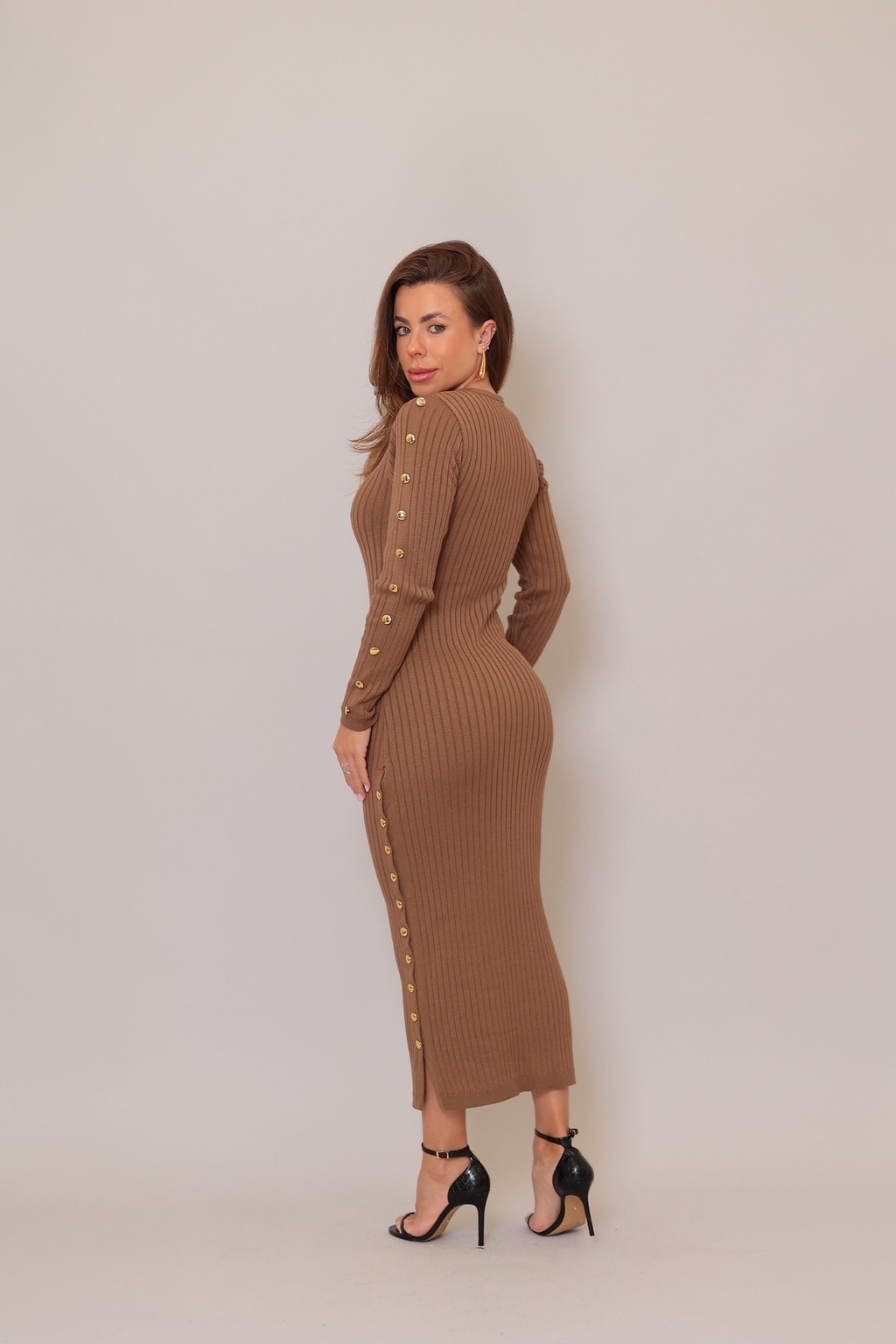 Seu comprimento midi e manga comprida com detalhes dourados evidenciam requinte, enquanto os botões laterais no quadril permitem abrir uma delicada fenda, valorizando a silhueta com charme.