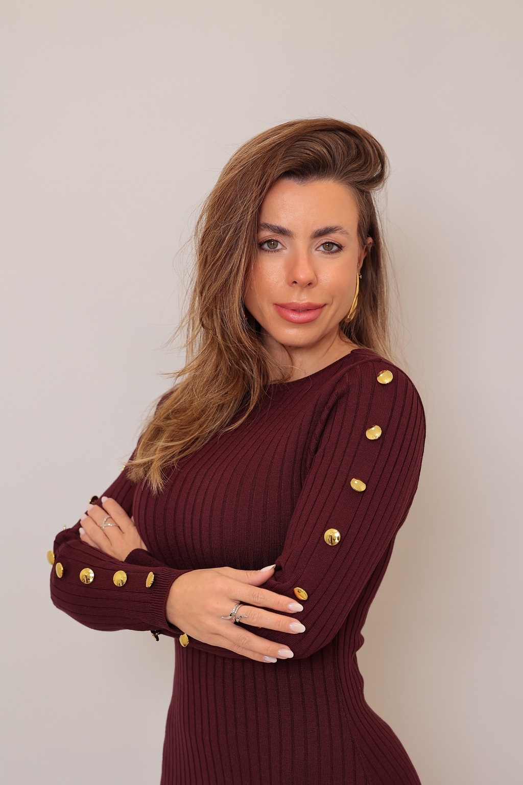 Seu comprimento midi e manga comprida com detalhes dourados evidenciam requinte, enquanto os botões laterais no quadril permitem abrir uma delicada fenda, valorizando a silhueta com charme.